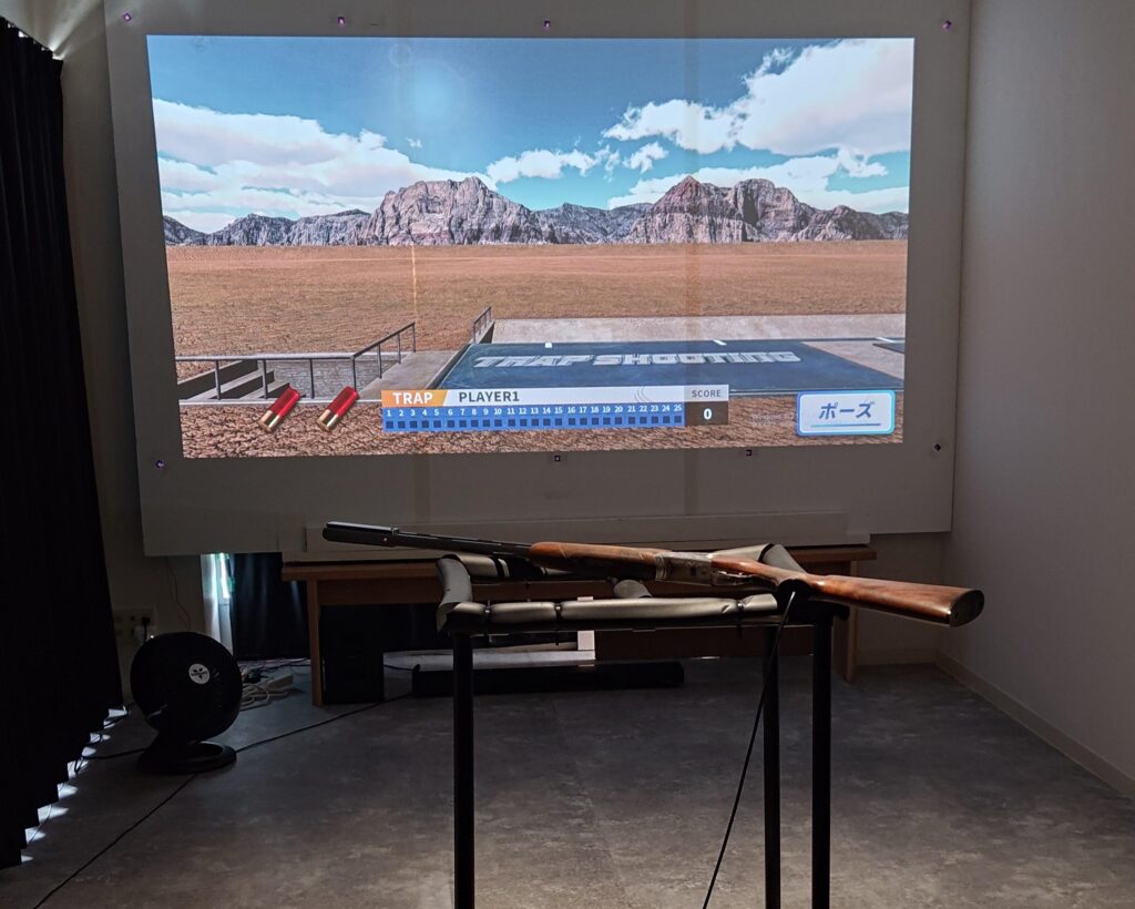 クレーシミュレーターのスクリーンは大画面であればあるほど良いと考えます。銃を大きく正確にコントロールすることが大事なクレー射撃ですが、小さいスクリーンでは小さい動きしかできず、実環境とはかけ離れた感覚になってしまいます。当店のスクリーンは2.7m×1.8mの超大型。120インチの大画面にリアルな映像を映し出します