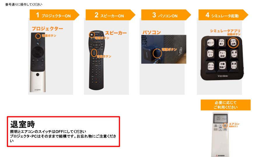 エアコンと照明の電源だけOFFにしてご退出ください。他の機材は電源ONのままで結構です